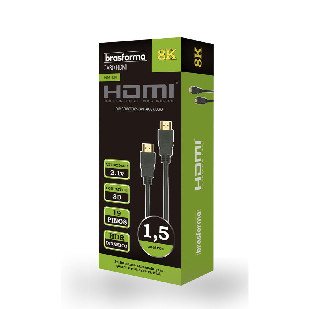 O Cabo HDMI 8001 possui 1,5 metros de comprimento e é ideal para quem procura a melhor qualidade de som e imagem com resolução Ultra HD de 8K. Os cabos HDMI 2.1 Brasforma são ideais para todos os seus dispositivos eletrônicos: Home Theater, Games, TVs 8K e muito mais. Possui contatos folheados a ouro, garantindo maior qualidade na hora de assistir seus programas favoritos.
