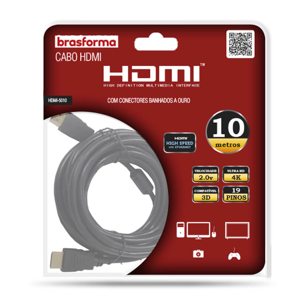 O Cabo HDMI 50010 possui 10 metros de comprimento e é ideal para quem procura a melhor qualidade de som e imagem com resolução Ultra HD de 4K. Os cabos HDMI 2.0 Brasforma são ideais para todos os seus dispositivos eletrônicos: Home Theater, Games, TVs 4K e muito mais. Possui contatos folheados a ouro, garantindo maior qualidade na hora de assistir seus programas favoritos.